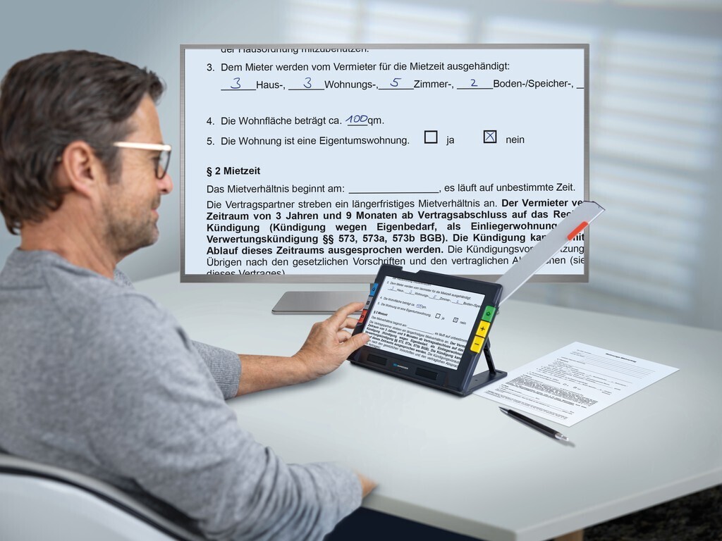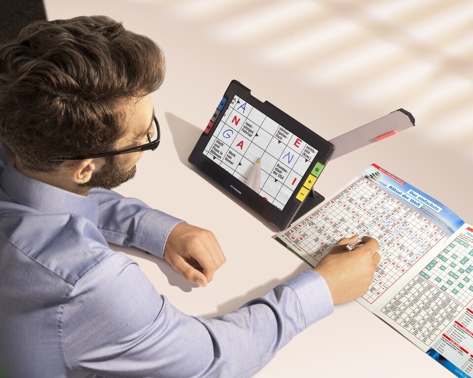 Innovative, elektronische Lupe in Tablet-Größe mit Vorlesefunktion und ausklappbarem Kameraarm.